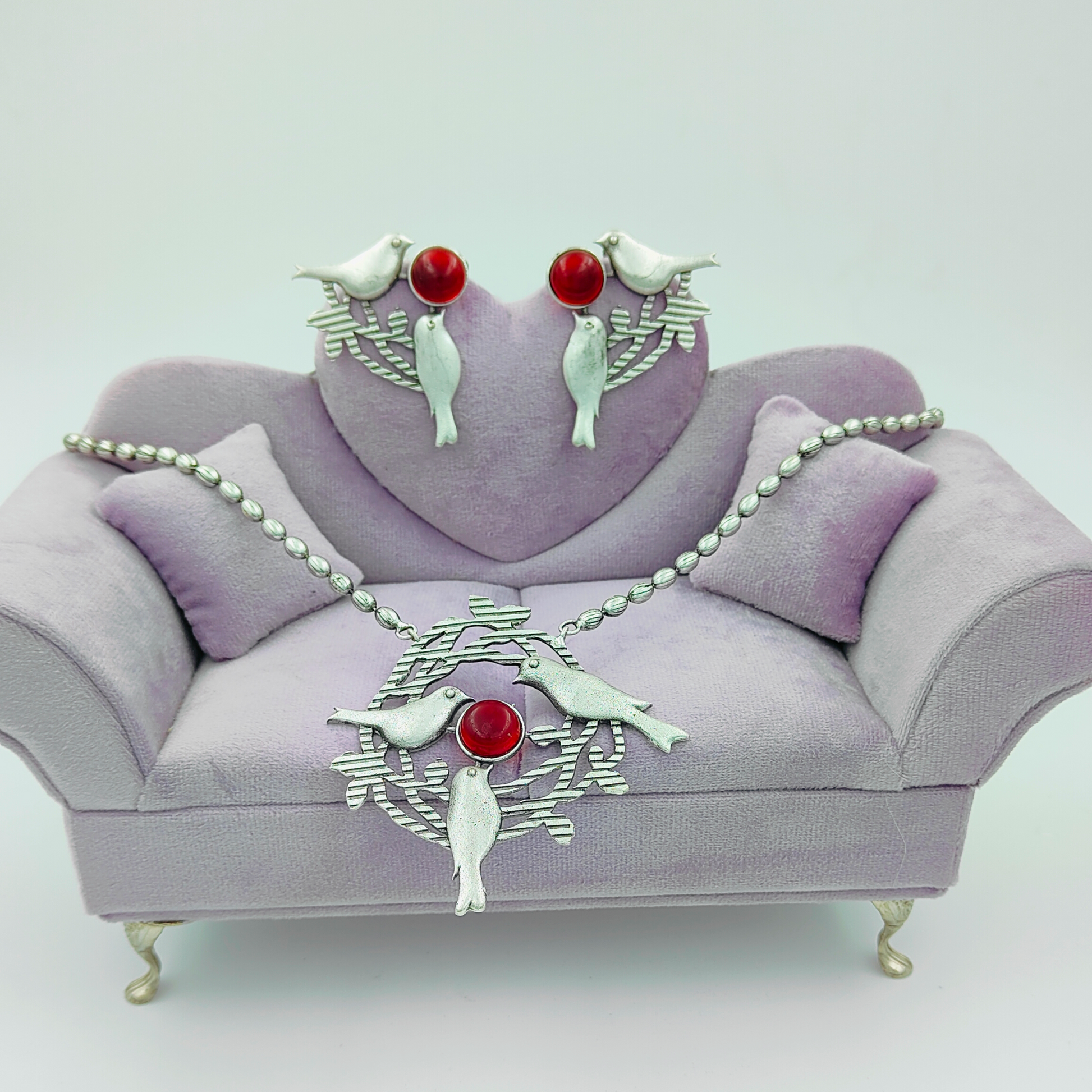 Birds Inspired Red Oxidised Silver Plated Long Chain Jewellery Set