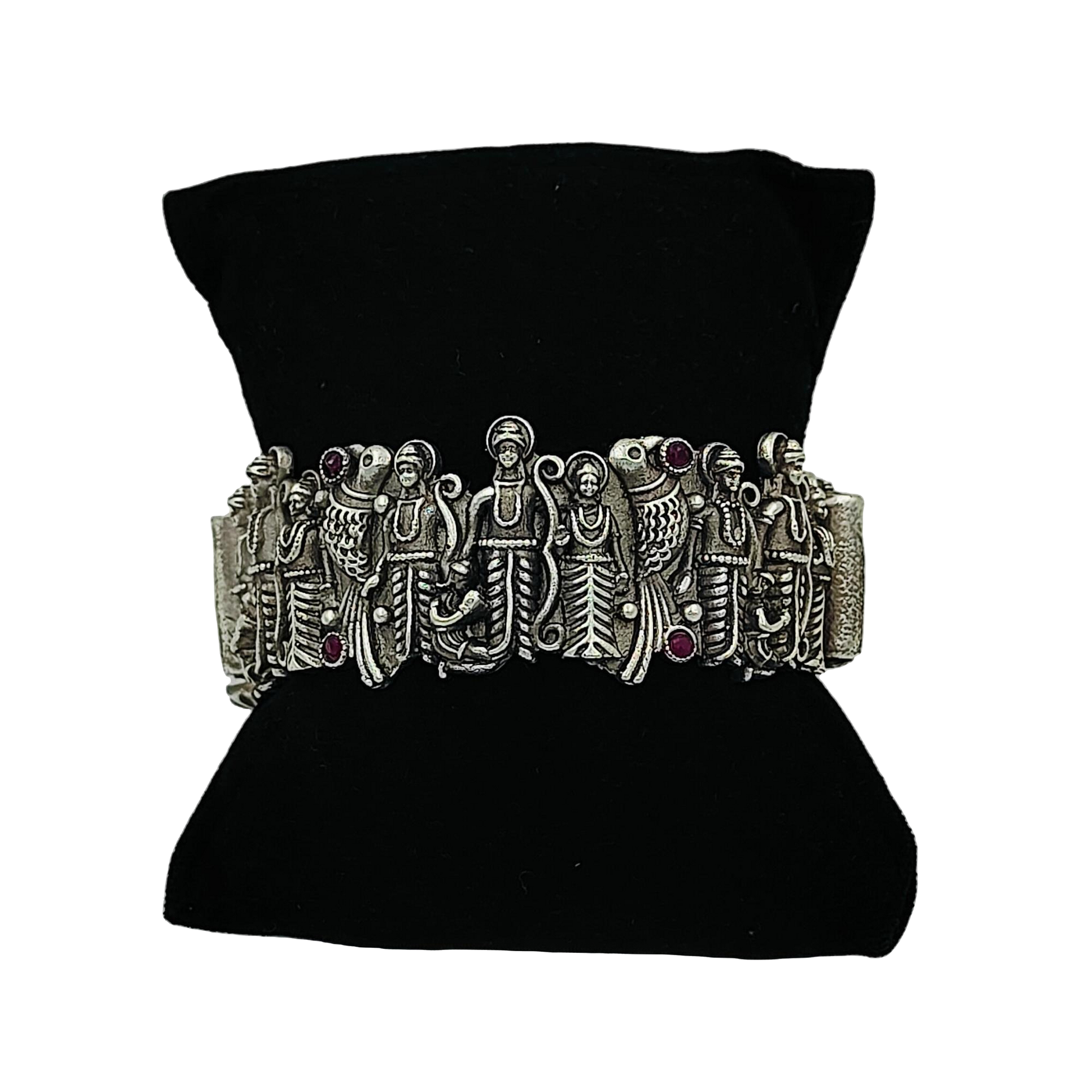 Celebrate divinity with the Emerald Ram Sita Ji Oxidised Kada, crafted with a unique oxidized finish and adorned with vibrant emerald stones. This kada beautifully symbolizes the strength and devotion of Lord Ram and Sita, adding spiritual elegance to your ensemble.