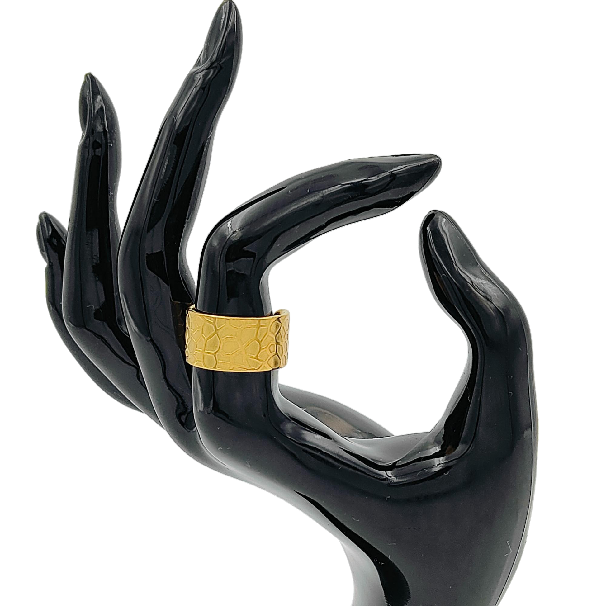 The Gold Engraved Finger Cuff is a bold yet refined piece featuring intricate engravings on a sleek gold band. Ideal for those who love a modern, edgy look with a touch of class.