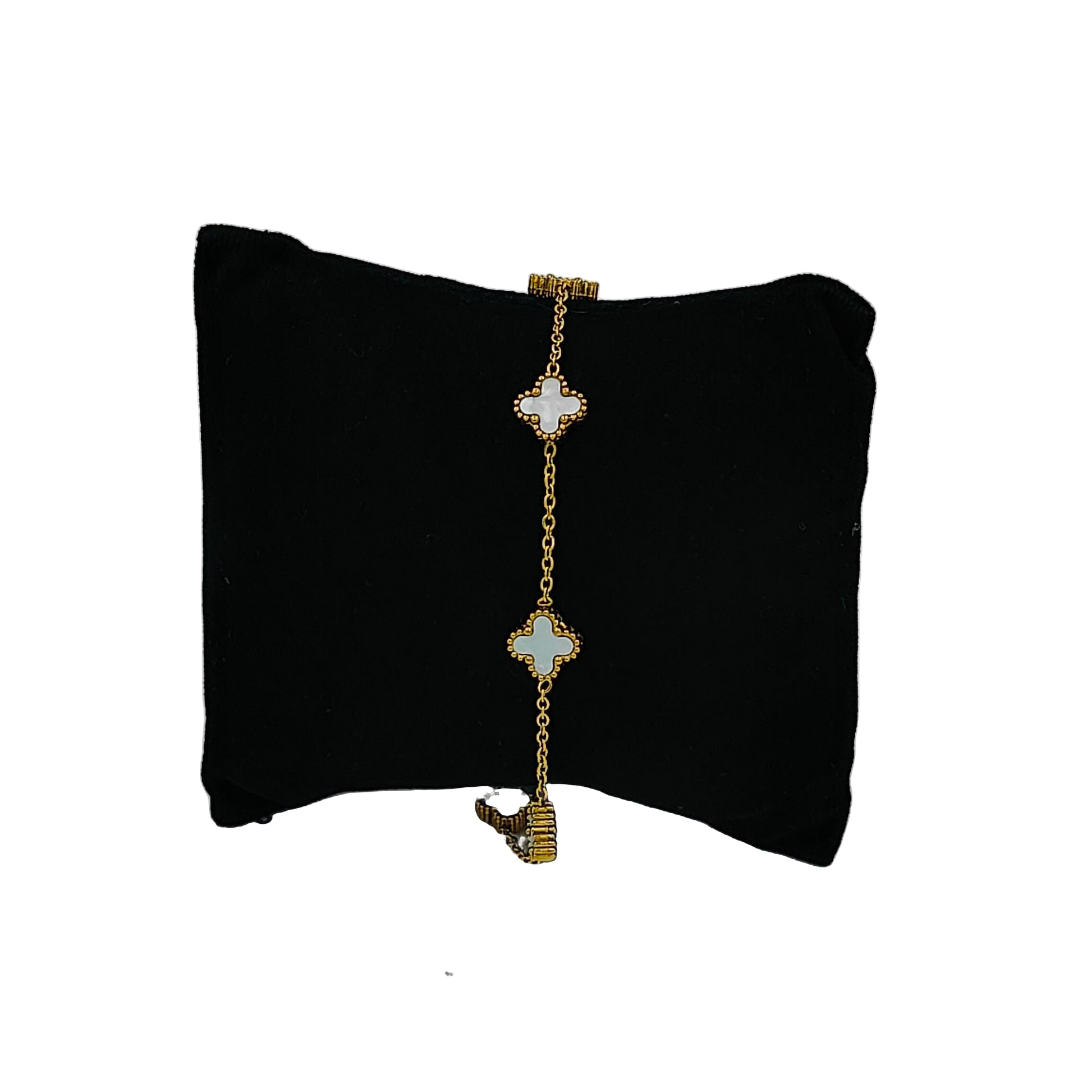 This delicate bracelet features a small clover design, crafted in gold plating with a white finish. The clover symbolizes good luck, making this a charming and meaningful piece for anyone seeking to add a touch of positivity to their look.