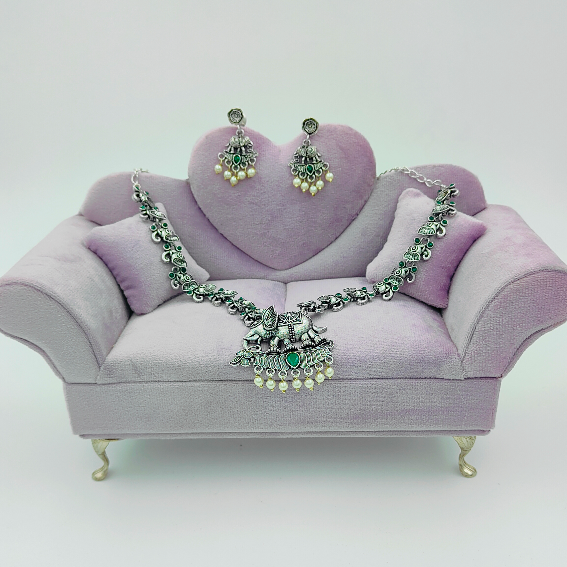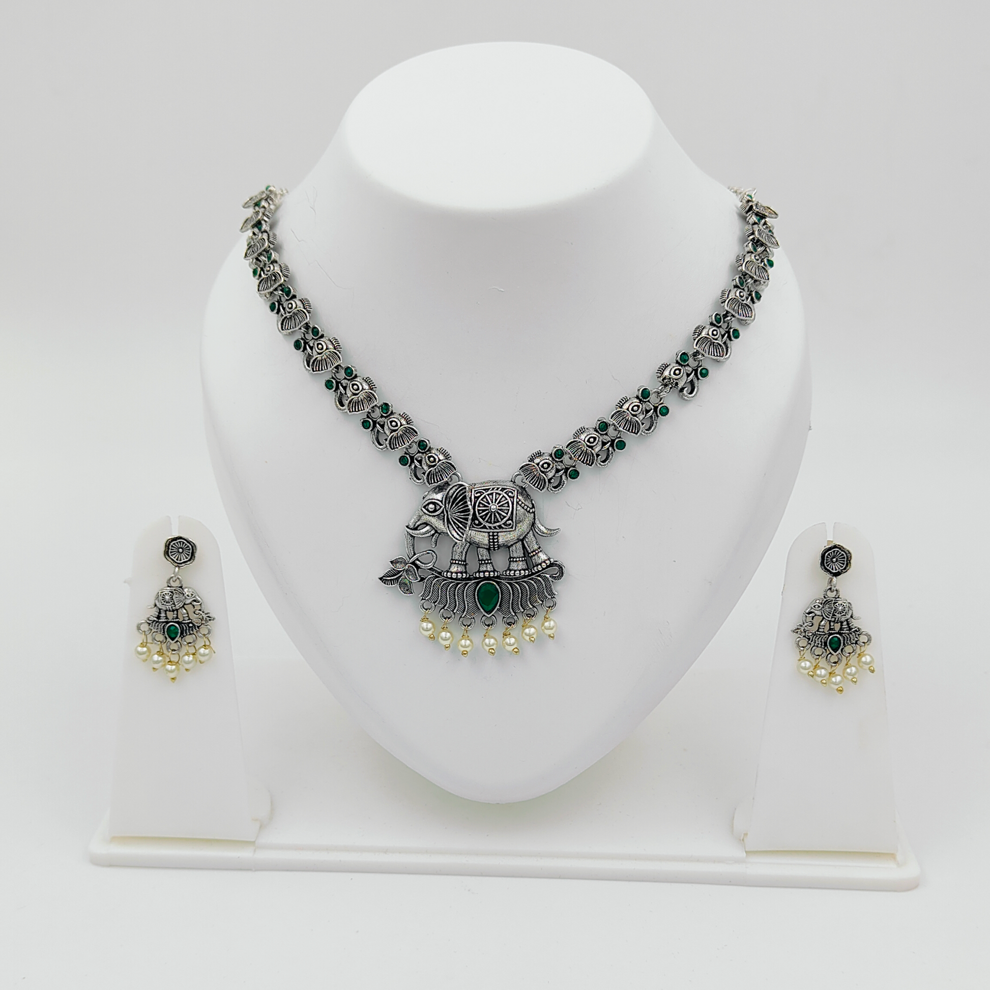 Green Elephant Oxidised Silver Plated Jewellery Set
