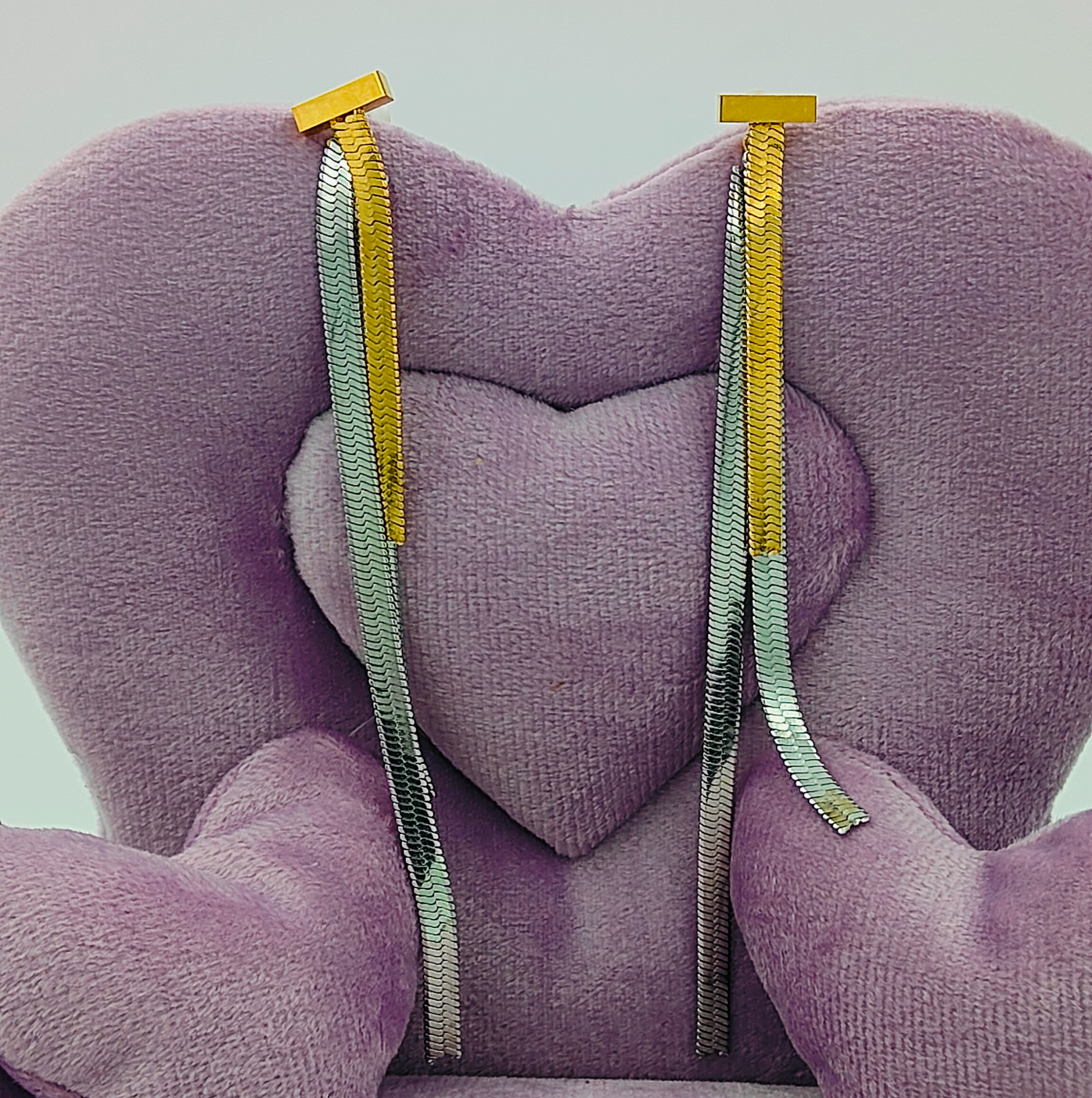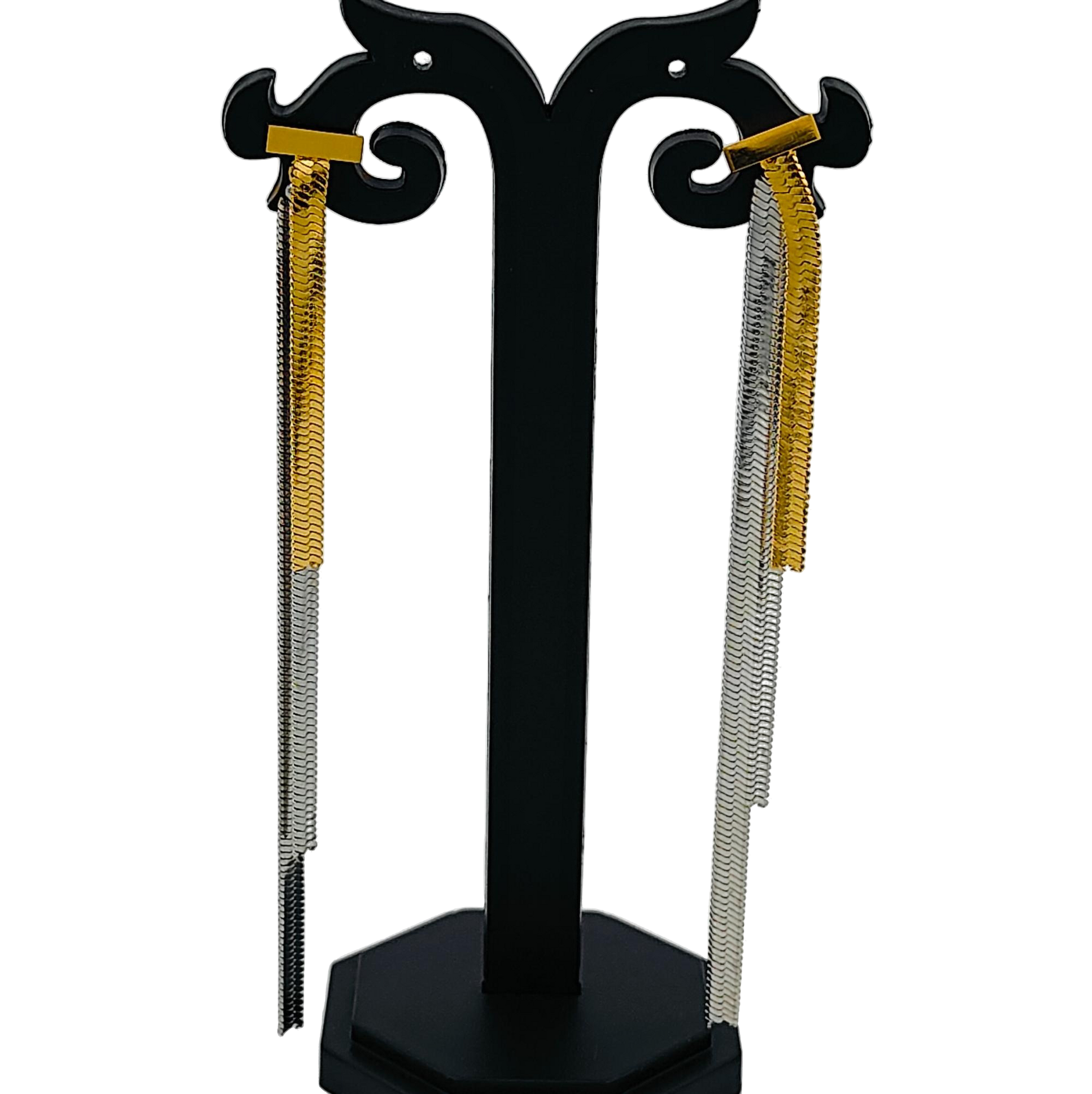 These snake chain earrings are a bold statement piece with their sleek, elongated design. Ideal for pairing with party attire.