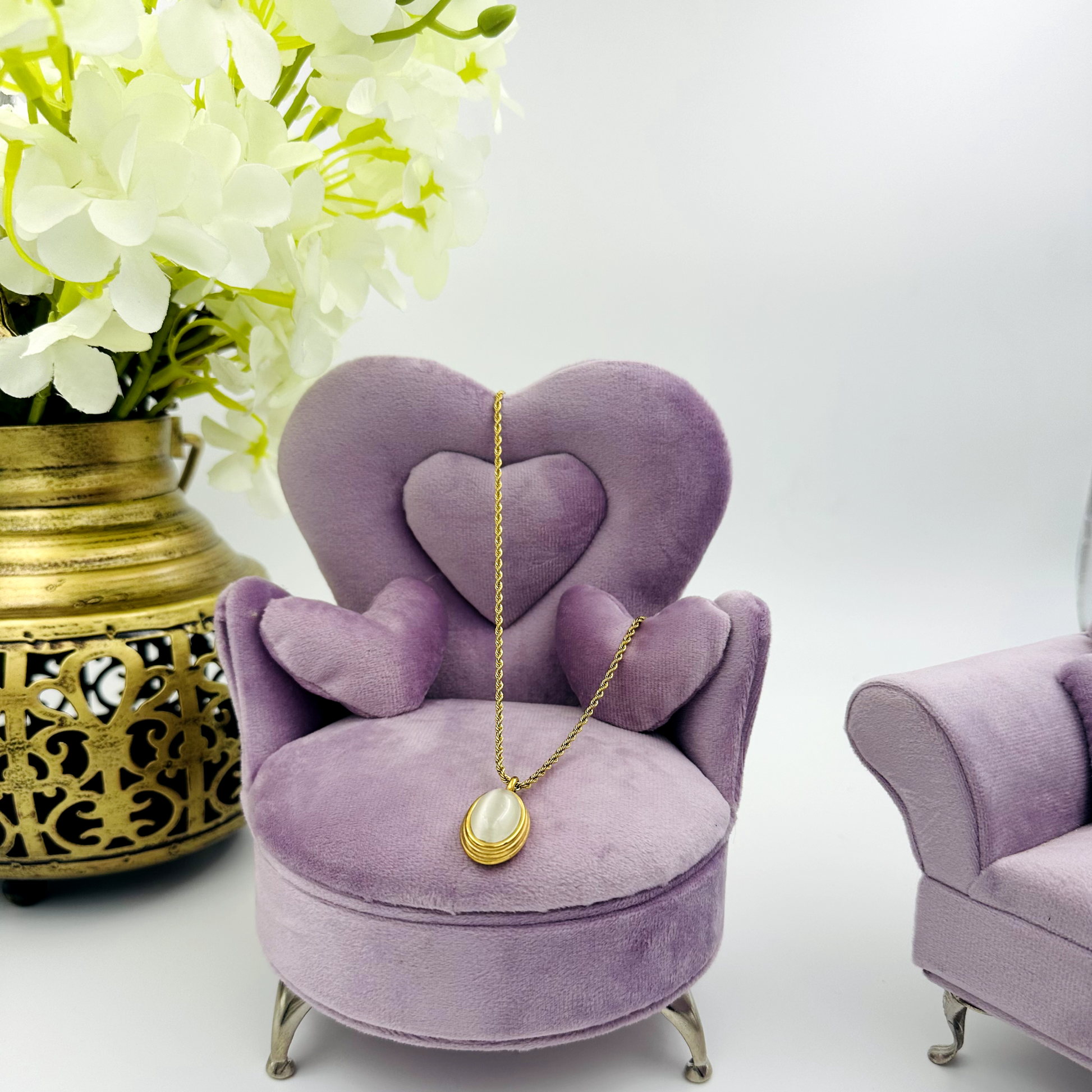 With its elegant twist chain and lustrous mother-of-pearl pendant, this necklace exudes sophistication and timeless beauty, perfect for both day and evening wear.