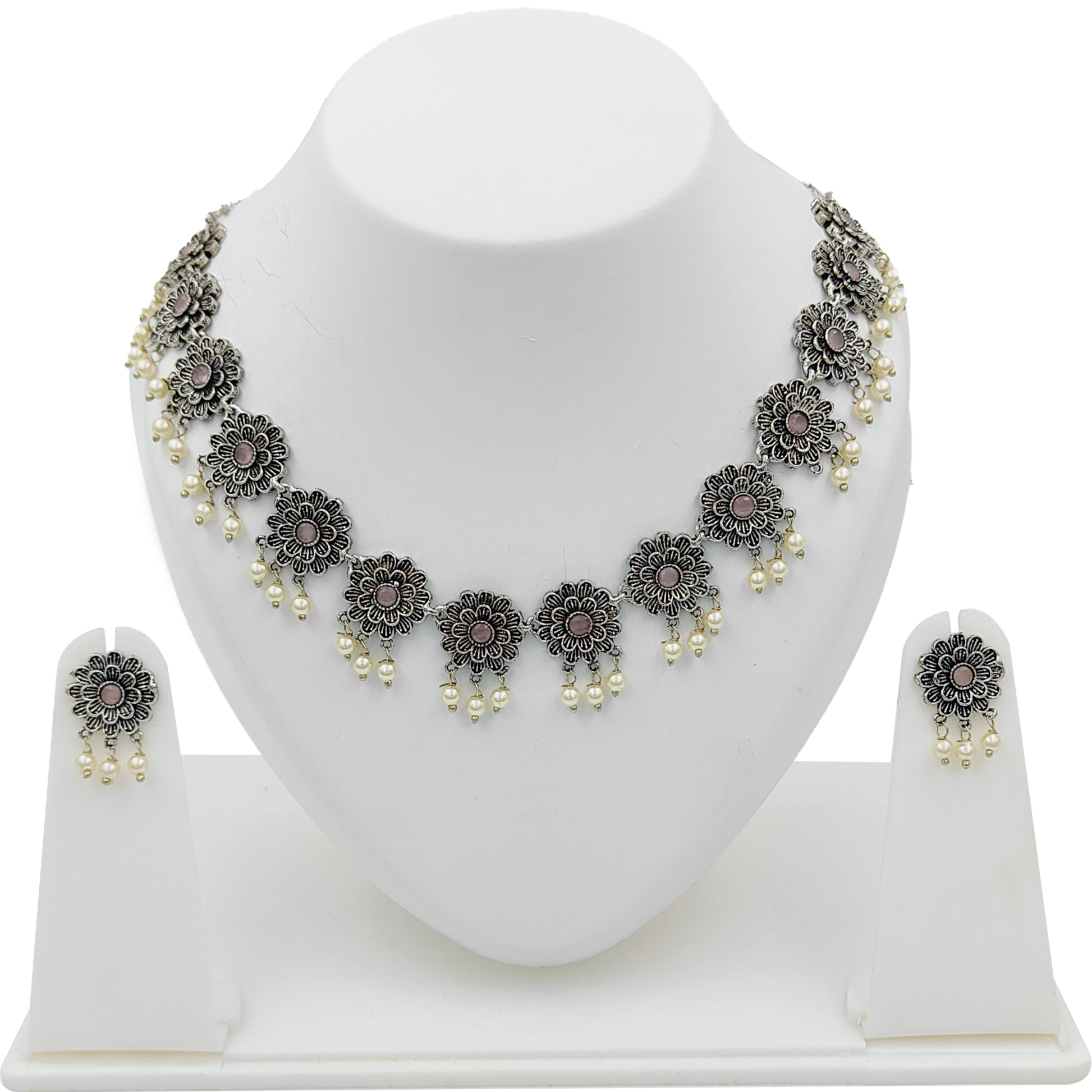 This pink oxidised silver-plated jewellery set offers a chic, feminine vibe with its delicate pink tones. Whether for daily wear or special events, this set brings an added pop of color to your ensemble, pairing beautifully with any outfit.
