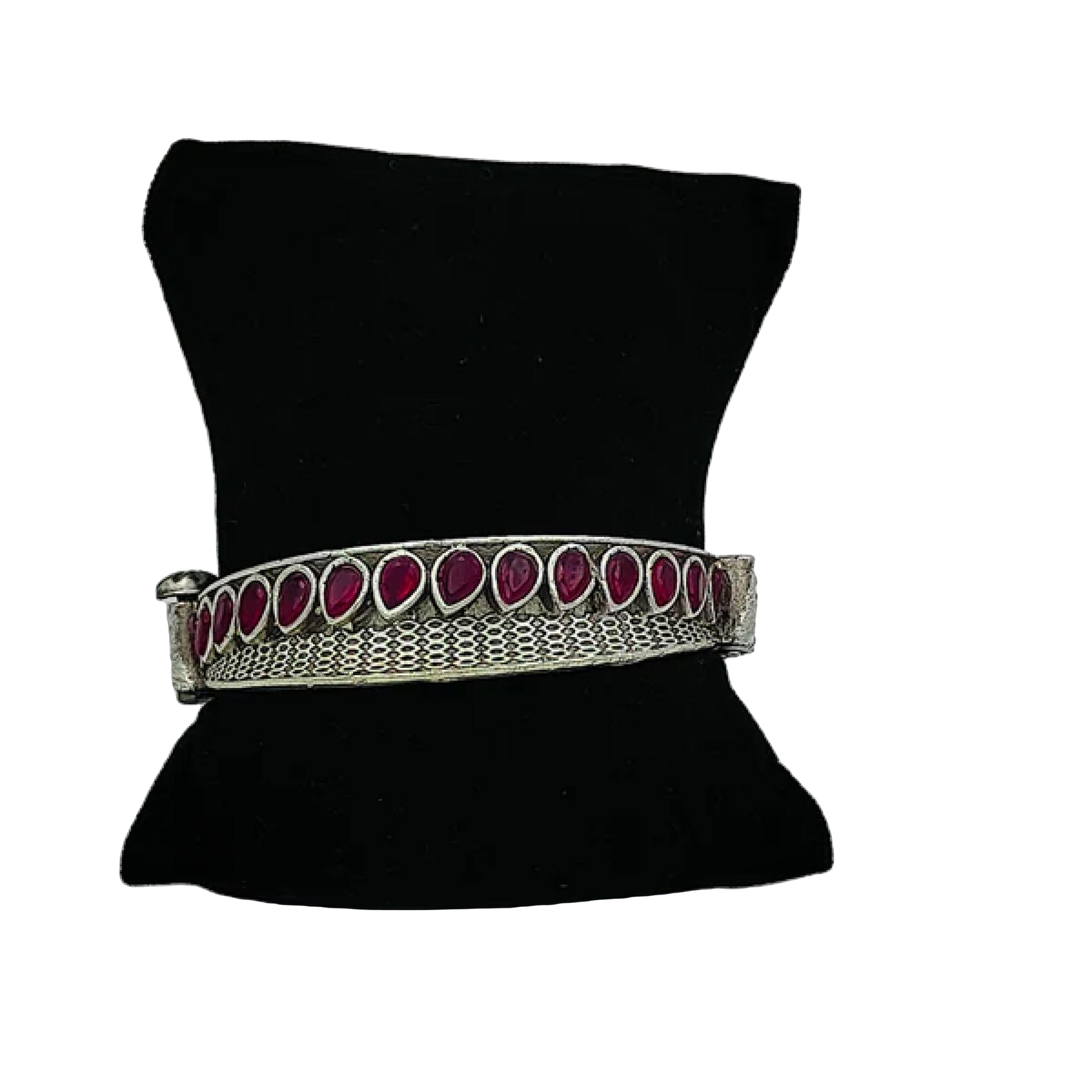 This ruby silver lookalike oxidized bangle blends the rich tones of ruby with a stunning oxidized finish. A versatile accessory, it can be paired with both traditional and contemporary outfits for an elegant statement.
