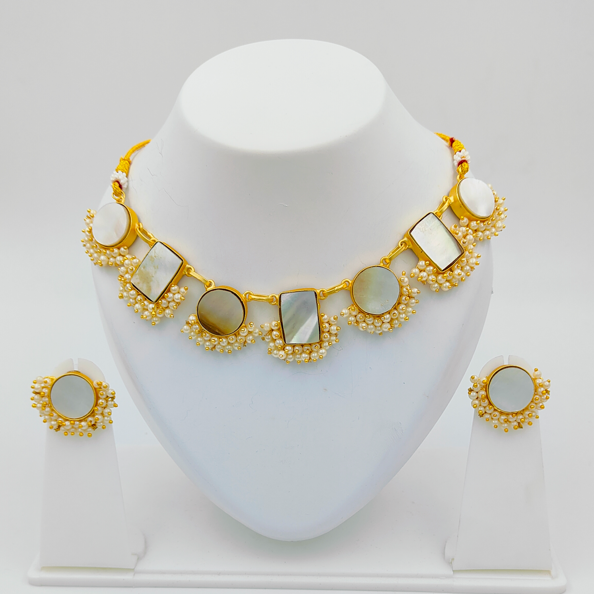 This exquisite golden pearl choker necklace features unique stone detailing that enhances its luxurious design. Perfect for formal events, this choker adds a touch of glamour and sophistication to your necklines.