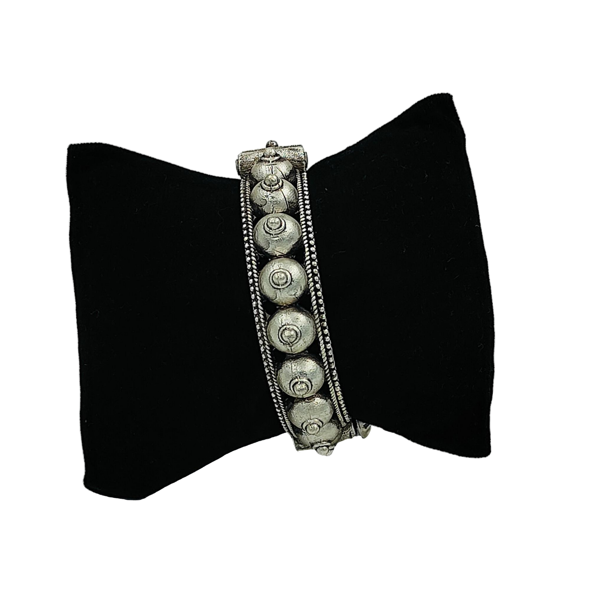 A contemporary take on traditional jewelry, this oxidized silver handcuff bangle kada features a unique closure design that is both stylish and secure. Perfect for those who enjoy bold, statement-making pieces.