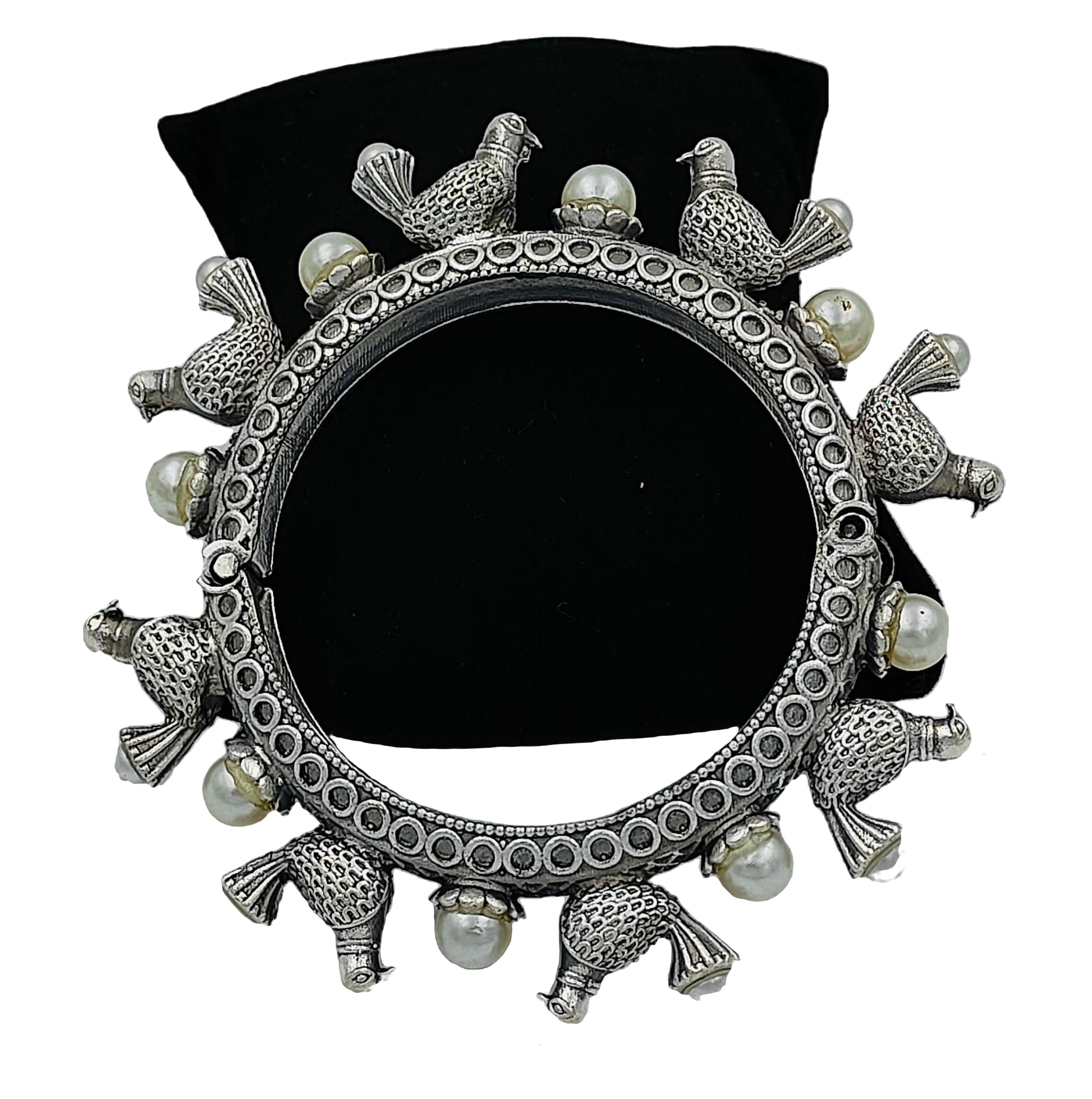 This silver oxidized cuff bracelet offers a bold, yet feminine design that pairs beautifully with a range of outfits. The open cuff style ensures easy wear while the oxidized finish gives it a vintage, rustic appeal.